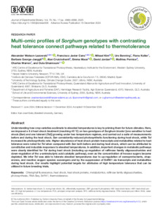 Multi-omic profiles of Sorghum genotypes with contrasting heat tolerance connect pathways related to thermotoleranceExport / Share PlumX Watson-Lazowski, A., Cano, F. J., Kim, M., Benning, U., Koller, F., George-Jaeggli, B., Cruickshank, A., Mace, E. S., Jordan, D., Pernice, M., Warren, C. and Ghannoum, O. (2024) Multi-omic profiles of Sorghum genotypes with contrasting heat tolerance connect pathways related to thermotolerance. Journal of Experimental Botany . https://doi.org/10.1093/jxb/erae506