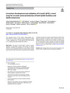 Development and validation of X-ComEC qPCR, a novel assay for accurate universal detection of both Xylella fastidiosa and Xylella taiwanensisExport / Share PlumX Wong-Bajracharya, J., Webster, J., Rigano, L. A., Kant, P., Englezou, A., Snijders, F., Agmon, D., Roach, R. L., Wang, C., Kehoe, M., Mann, R., Constable, F. E., Donovan, N. J. and Chapman, T. A. (2025) Development and validation of X-ComEC qPCR, a novel assay for accurate universal detection of both Xylella fastidiosa and Xylella taiwanensis. Australasian Plant Pathology . https://doi.org/10.1007/s13313-025-01051-4