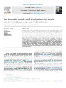 Root decomposition in coastal wetlands of Southeast Queensland, AustraliaExport / Share PlumX View Altmetrics View AltmetricsKwan, V., Bennion, V., Hayes, M. A. and Lovelock, C. E. (2025) Root decomposition in coastal wetlands of Southeast Queensland, Australia. Estuarine, Coastal and Shelf Science . https://doi.org/10.1016/j.ecss.2025.109547