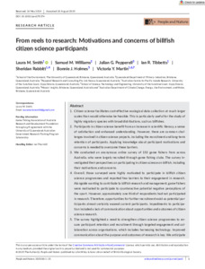 From reels to research: Motivations and concerns of billfish citizen science participantsExport / Share PlumX View Altmetrics View AltmetricsSmith, L. M., Williams, S. M., Pepperell, J. G., Tibbetts, I. R., Rabbitt, S., Holmes, B. J. and Martin, V. Y. (2025) From reels to research: Motivations and concerns of billfish citizen science participants. People and Nature . https://doi.org/10.1002/pan3.70174