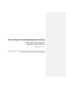 Overcoming passionfruit virusesExport / Share Gambley, C., Anderson, J., Crew, K. S., Manners, A. G., Dean, J. R., Coates, L. M., Campbell, P. R., Cremer, J. E., Persley, D. M. and Thomas, J. E. (2015) Overcoming passionfruit viruses. Project Report. Horticulture Innovation Australia.