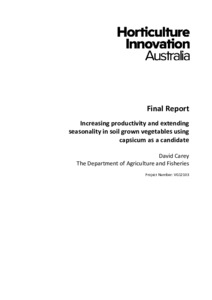 Increasing productivity and extending seasonality in soil grown vegetables using capsicum as a candidateExport / Share Carey, D. (2016) Increasing productivity and extending seasonality in soil grown vegetables using capsicum as a candidate. Project Report. Horticulture Innovation Australia.