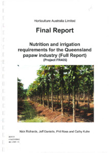 Nutrition and irrigation requirements for the Queensland papaw industryExport / Share Richards, N., Daniells, J. W., Ross, P. and Kuhn, C. (2005) Nutrition and irrigation requirements for the Queensland papaw industry. Project Report. Horticulture Australia Ltd.