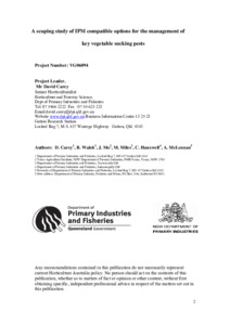 A scoping study of IPM compatible options for the management of key vegetable sucking pestsExport / Share Carey, D., Walsh, B., Mo, J., Miles, M., Hauxwell, C. and McLennan, A. (2008) A scoping study of IPM compatible options for the management of key vegetable sucking pests. Project Report. Horticulture Australia.