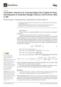 Correction: Growing Degree Day Targets for Fruit Development of Australian Mango CultivarsExport / Share PlumX Amaral, M. H., McConchie, C., Dickinson, G. R. and Walsh, K. B. (2025) Correction: Growing Degree Day Targets for Fruit Development of Australian Mango Cultivars. Horticulturae, 11 (11). p. 1294. https://doi.org/10.3390/horticulturae11111294