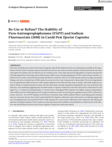 Re‐Use or Refuse? The Stability of Para‐Aminopropiophenone (PAPP) and Sodium Fluoroacetate (1080) in Canid Pest Ejector CapsulesExport / Share PlumX Gentle, M., Harriott, L., Kelly, C. and Kreplins, T. (2026) Re‐Use or Refuse? The Stability of Para‐Aminopropiophenone (PAPP) and Sodium Fluoroacetate (1080) in Canid Pest Ejector Capsules. Ecological Management & Restoration, 27 (2). https://doi.org/10.1111/emr.70038