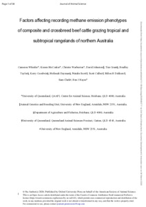 Factors affecting recording methane emission phenotypes of composite and crossbreed beef cattle grazing tropical and subtropical rangelands of northern AustraliaExport / Share PlumX Whistler, C., McCosker, K., Warburton, C., Johnston, D., Grant, T., Taylor, B., Goodwin, K., Dayman, M., Scott, N., Cullen, S., Dekkers, M. H., Clark, S. and Hayes, B. J. (2026) Factors affecting recording methane emission phenotypes of composite and crossbreed beef cattle grazing tropical and subtropical rangelands of northern Australia. Journal of Animal Science . https://doi.org/10.1093/jas/skag050