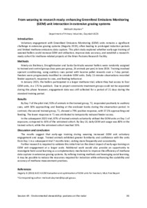 Organisation URL: https://dpi.primo.exlibrisgroup.com/permalink/61DOAAF_INST/1km05pd/alma991000590765605056 AbstractVoluntary engagement with Greenfeed Emissions Monitoring (GEM) units remains a significant challenge in extensive grazing systems (Hegarty 2019), often leading to prolonged induction periods and limited methane emissions data capture. This pilot study explored whether early-age training of weaned heifers could increase GEM unit utilisation, improve data accuracy, and establish a research ready cohort for methane-related projects at the Brian Pastures Research Facility.