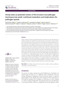 Honey bees as potential vectors of the invasive rust pathogen Austropuccinia psidii: nutritional mutualism and implications for pathogen spreadExport / Share PlumX Shin-Clayton, S., Mortensen, A. N., Beggs, J. R., Buxton, M. N., Hauxwell, C., Bateson, M. F., Jochym, M., Pegg, G. S. and Pattemore, D. E. (2026) Honey bees as potential vectors of the invasive rust pathogen Austropuccinia psidii: nutritional mutualism and implications for pathogen spread. NeoBiota, 106 . pp. 75-90. https://doi.org/10.3897/neobiota.106.169027